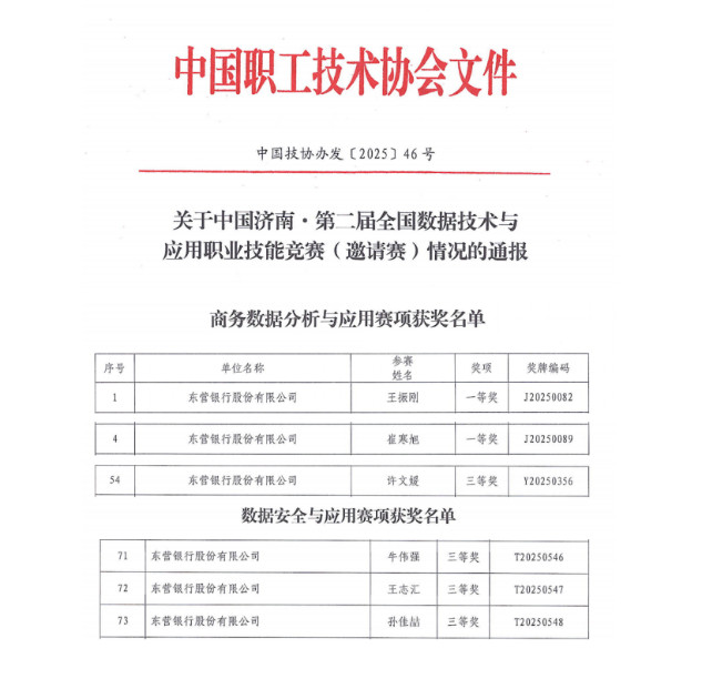 第二届寰球数据工夫与专揽作事手段竞赛由中国职工工夫协会、山东省总工会共同主持,成就数据身分×工夫与专揽、商务数据分析与专揽、数据安全与专揽三个赛说念,诱惑寰球12个省、28个地市889名从事数据工夫与专揽联系责任的企作事单元职工参赛。这次寰球竞赛的优异发扬,不仅是对获奖职工个东说念主才智的认同,更是东营银行数字化转型与东说念主才培养政策的阶段性后果。松手2025年11月末,东营银行财富总数冲破2630亿元,进款...